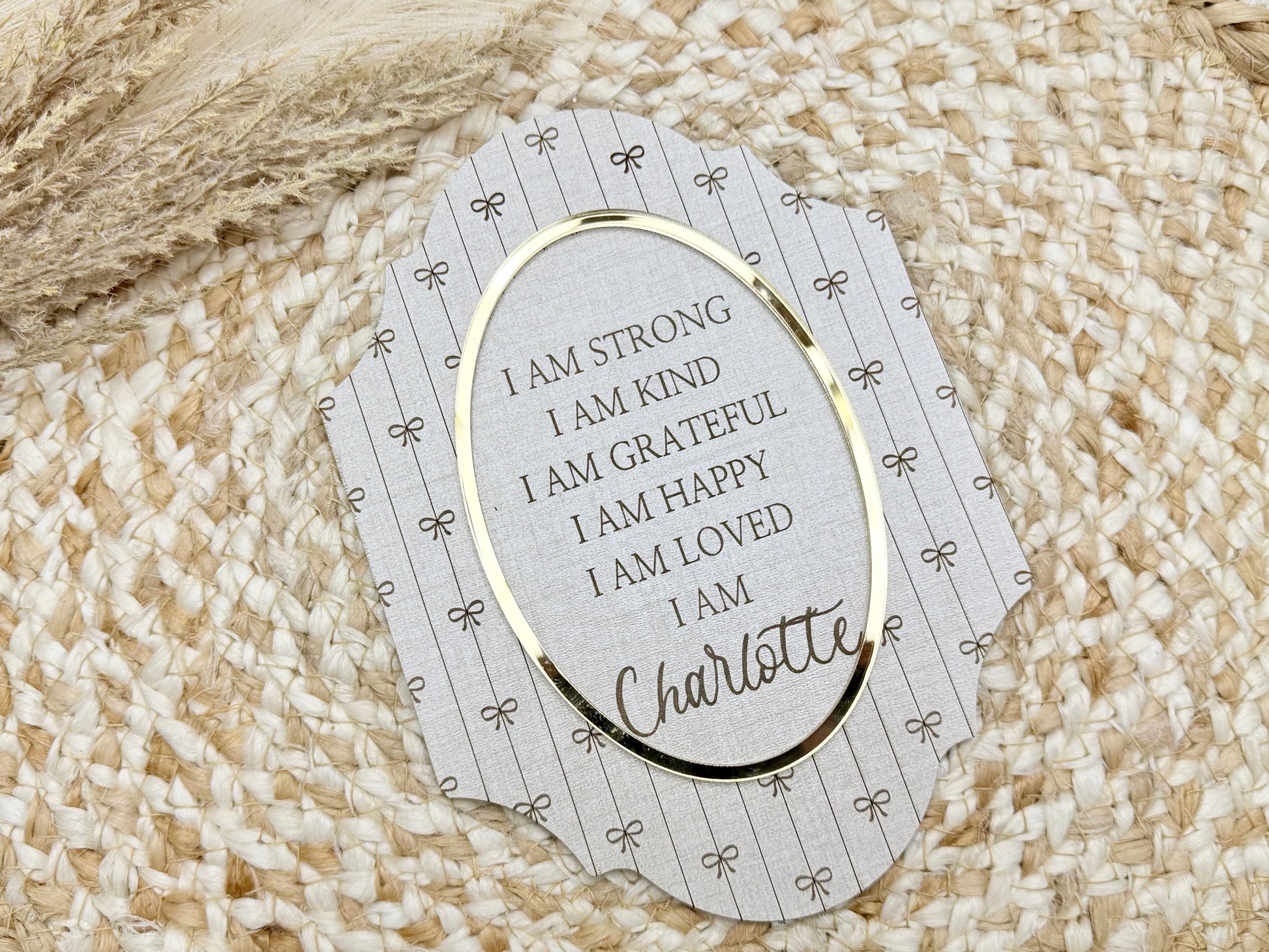 Beautifully handcrafted from premium pre-finished wood, this elegant plaque features a soft linen-inspired background adorned with engraved coquette bow details and framed in a delicate gold acrylic accent ring.